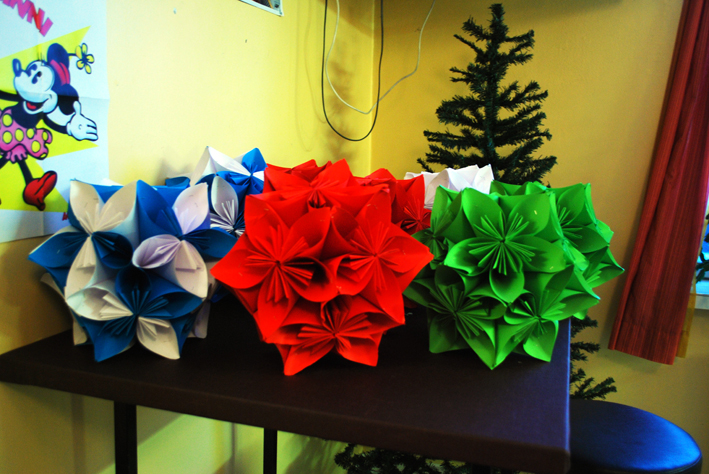 Kyseiset koristepallot tein Outokummun nuorisokahvila Servolla kahden ohjaajan, kaverini ja mieheni avustuksella. Kuulun tätä nykyään Outokummun nuorisoneuvostoon, joka auttoi nuorisokahvilaa itsenäisyyspäivän aattona vietetyssä juhlassa. Koska en voi koskaan vastustaa käsitöitä, tulin kihlattuni ja kaverini kanssa auttelemaan koristeiden teossa Servon ohjaajia. Olen itse tehnyt tuon punaisen palluran alusta loppuun saakka sekä puolet toisesta sinivalkeasta. Teko-ohje oli helppo ja palloista tuli kauniita, ainoa päänvaiva oli saada pallurat roikkumaan verhonipsuttimista ilmaan..